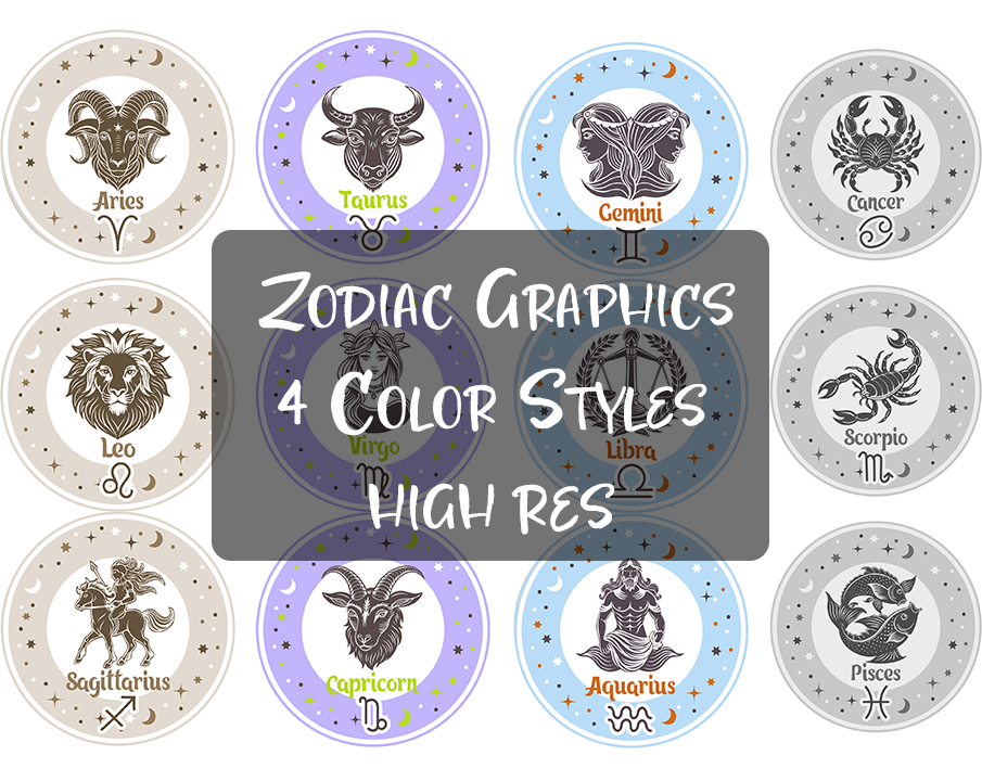 All 12 Zodiac signs in 4 different color themes, ideal for art, crafting, stickers, gifts, wallpapers, wall art, and more. High resolution PNGs can easily be resized for your project.